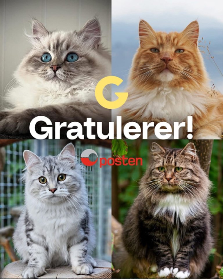 Gratulerer så mye til de vakre kattene Mio, Primus, Hyacinth og Raija, som sommeren 2026 blir å se på Postens frimerker! Tusen takk til alle 9000 som bidro med flotte bilder.